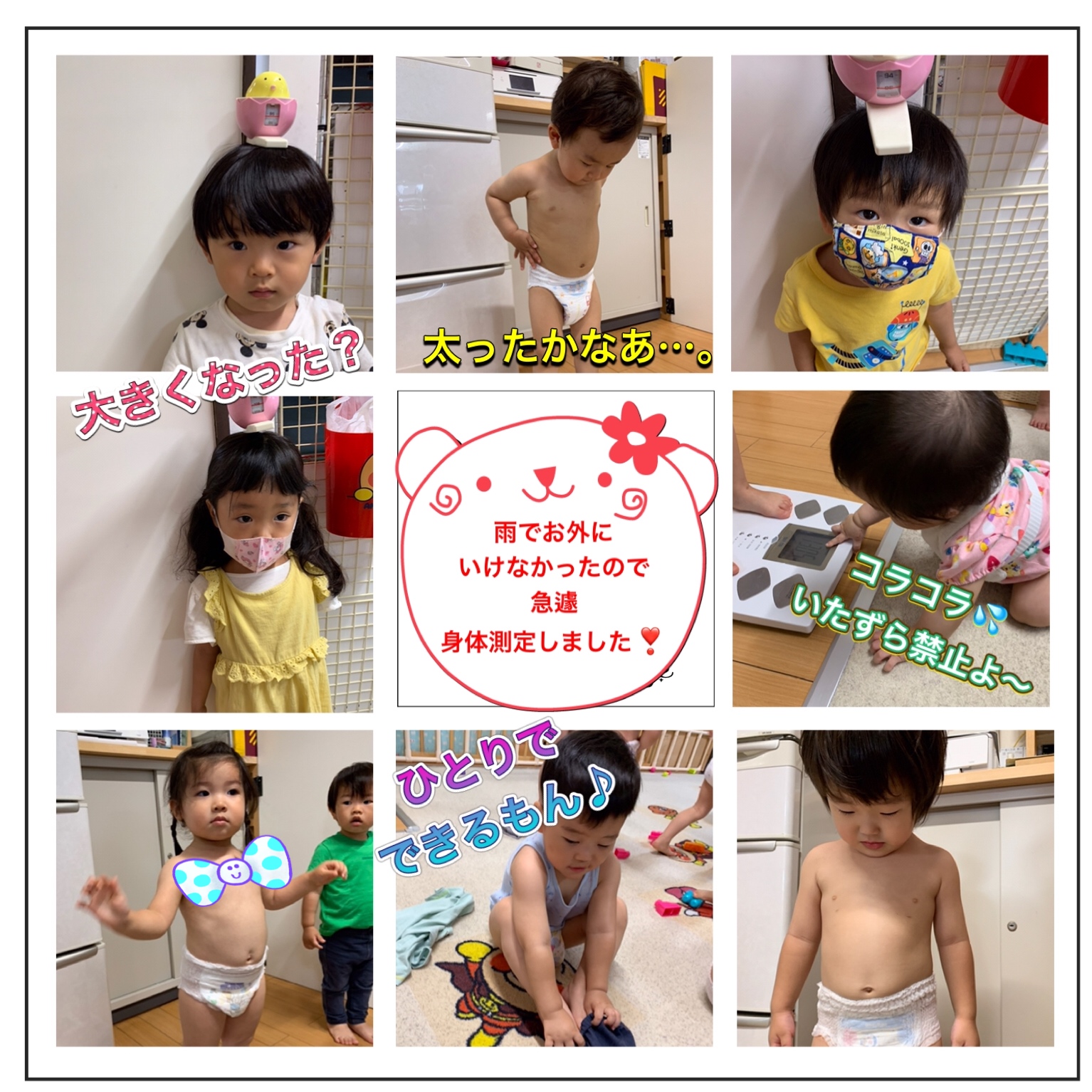 ほっこり♪ 2021.10.132021.06.14 午前中は雨が残っていたので、お散歩には出ずお部屋遊び。 💡ならば、この時間を使って身体測定をしよう〜ヽ(´▽`)/ みんな体重、身長共に増えて、 スクスク成長してました😊 午後は雨もあがったので、順番こにおさんぽ♪ 2歳女子さん達の会話。。。 「りんちゃん、りんご🍎ジュースがすき〜」 「ゆうきはりんご1個🍎がすき〜」 可愛い会話にほっこりです😊
