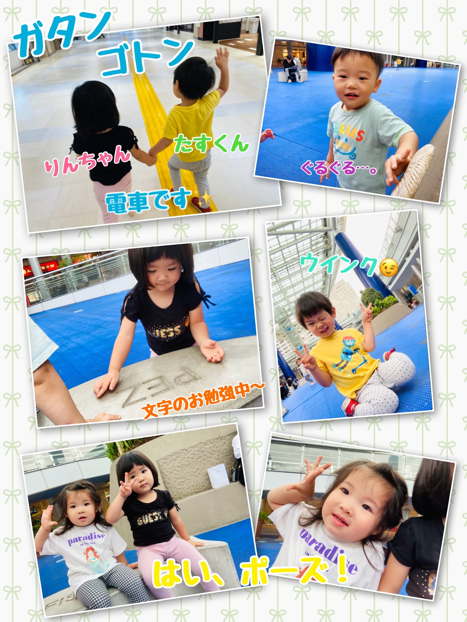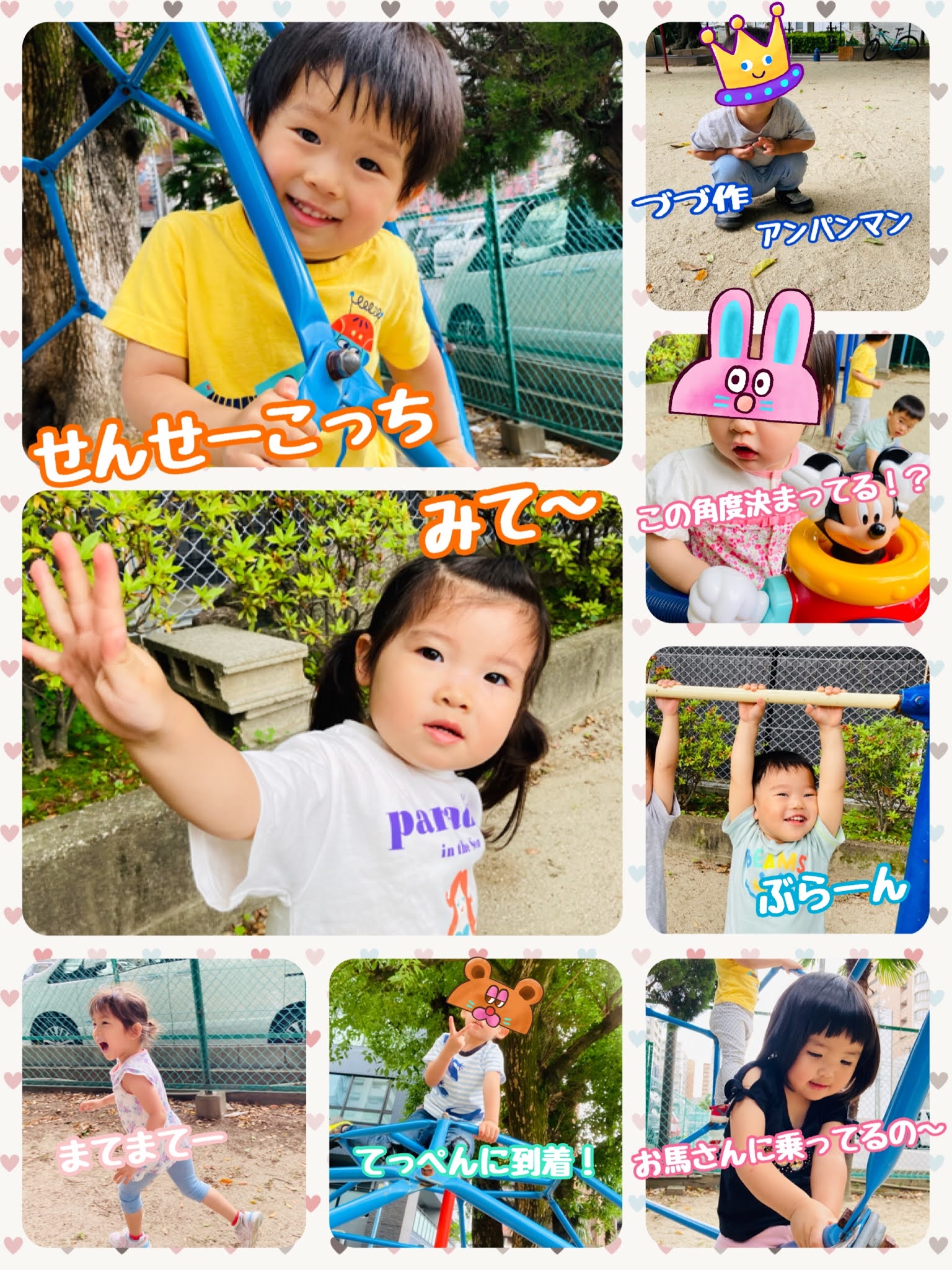 Untitled Post 2021.10.132021.06.02 不安定なお天気の日でしたね😂💦 午前中はみんなでしょうちゃん公園へ バッチリ、虫除けスプレーしていきました〜👍🏻 着くなり今日はみんなみてみて〜の日で、先生たち目が足りないぐらい呼ばれて いいお顔の写真いっぱい撮れました😊❣️ 午後からは、お散歩に出たらポツポツの雨… 急きょ、地下へ😅 りんちゃん・たすくん列車でオアシスへ行ってきました‼️ オアシスでは、文字のお勉強したり、プチかくれんぼしたりと過ごしました〜✨💕