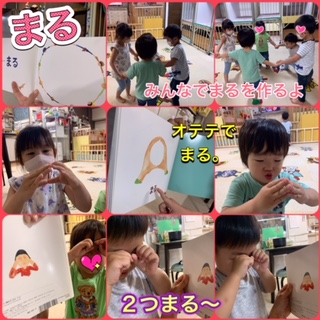 まる!できたかな? 2021.10.132021.06.02 午前中は大勢で通称しょうちゃん公園まで遊びに行ってきました! 午後は、2班に分かれて、順番こにお散歩だったので、 待ってる間、絵本タイム❣️ その中で 『まるをつくろう』がみんなお気に入りのご様子。 絵本に沿って、同じように真似っこしてまるを作って遊んだよ❣️ 異年齢で手を繋いで大きな輪も作れて、絵本の力にびっくり😊 みんな上手にできました👏👏