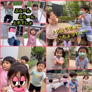 たっくんとつきちゃんは、ちょうちょを見つけて、追いかけた後