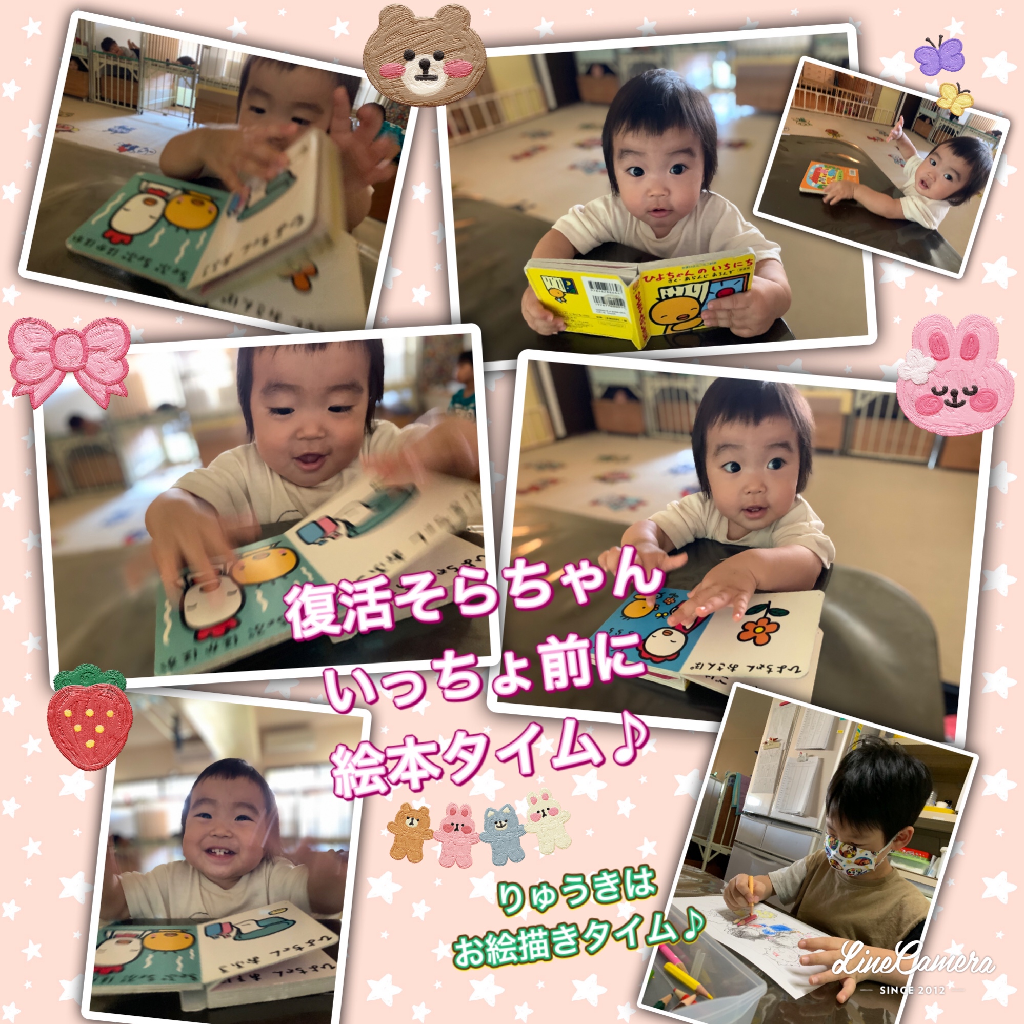 2021年10月02日 ~日々の記録~ 2021.10.132021.10.02 午前中は日差しが強く、10月なのにまだまだ暑い💦😵 歩き始めすぐにみんな「暑い〜💦」を連呼😅 と、言うわけで、噴水広場とミスト付近をお散歩してきました😊 ミスト待ちでしたが、木陰は風が涼しくて快適だったね(笑) 芝生広場へ行ったチームも涼しかったので、いっぱい動いてきたね(笑) そして、久しぶりの登園となったそらちゃん。 みんながお昼寝中、絶好調だったので、絵本タイム♪ いっちょ前の姿が可愛すぎたので、今日は多めにコラージュしちゃいました😁😁