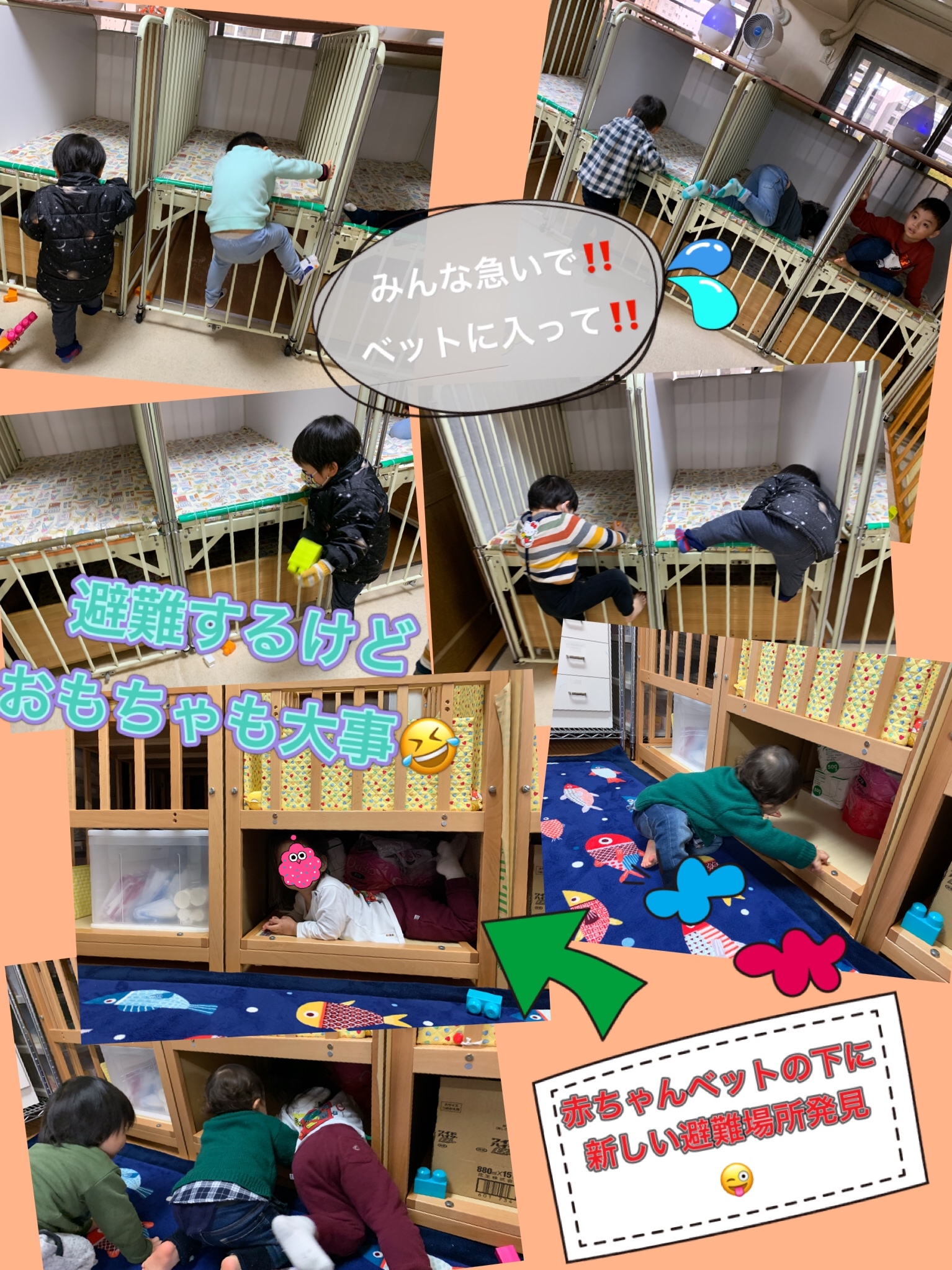 練習では完璧です👌 2021.10.132021.02.15 先日の大きな地震、皆さん大丈夫でしたか? 東日本大地震から10年というのと、同じように東北での地震にまた心配をしました🤭 それを踏まえてアップル園でも定期的に地震や火事などの防災訓練をしています😊 慣れた?ものでベッドに避難するのも上手‼️ でもあれ?🙄 1人足りない… って思ったら赤ちゃんベットの下に😂 いつもは備品が詰めてあるから入れないのに… お子ちゃまってスペースを見つけるのが上手です🙆♂️笑 たっくん!おもちゃ持ってったら逃げ遅れちゃうよー💦笑