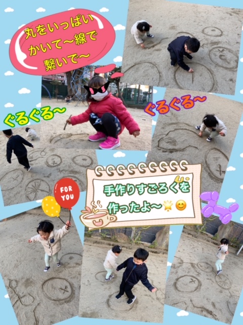 Untitled Post 2021.10.132021.02.08 公園にるんるんで出発しましたが気温が下がっているせいかやっぱり遊具が冷たくて みんなすぐ遊具から離れてしまいました😂😅 するとたくさん丸をかいていたのでそのまますごろくを作ることに✨👍🏻 おっきい丸や丸の中にバツをかいてしっかり一回休みのマスも作って🤣🤣 ジャンプしたり走ったりとすごろくの進み方はみんなそれぞれでした😝