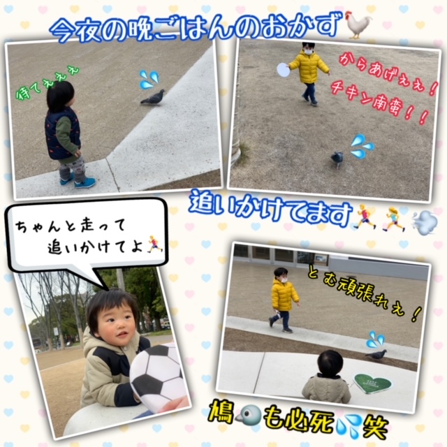 一狩り行こうぜ‼️(お散歩 2021.10.132021.01.28 朝一のお散歩ではふわふわのフリスビーを持って芝生に行ったけど前日の雨で少し濡れ気味☔️ どうしようかねぇ⁉️🤔と悩んでると鳩が近くに集まってきました🐦🐦🐦 そうなると始まっちゃいますよね😊 追いかけっこ🏃♂️🏃♀️💨笑 今夜の晩御飯のおかずにするべくみんなで追いかけちゃいました😳笑 鳩さんごめんね💦笑 少し気温がさがって肌寒かったけど、走ってポカポカに😳💦 捕まえれなかったから今日は白飯のみだね🍚😂笑