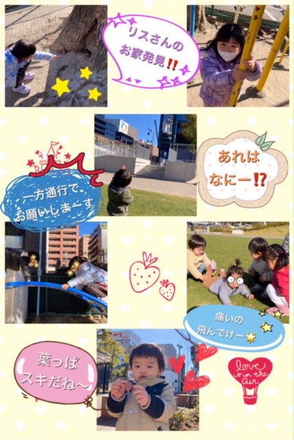新しい発見いっぱい⁉️ 2021.10.132021.01.20 午前中の大きいチームは、公園へ行ってきました‼️ 今日は風があまり無く、いいお天気でした😊 遊具で遊んだり、木の根のところでリスさんのお家を見つけたりと楽しく遊びました🌟 小さい子チームは、みんなでお散歩✨ いっしょに遊んだり、新しい発見があったりと楽しそうでした😉 午後も順番にお散歩行きましたよ✨ 異年齢でも、みんな一緒に遊んでくれるので良い写真いっぱい撮れました❣️