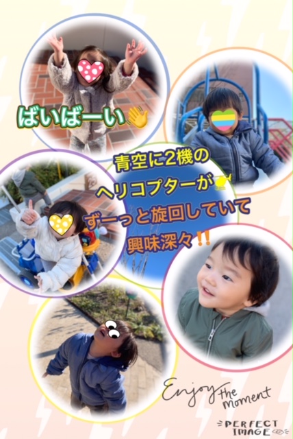 お空におーーーい♪ 😊 2021.10.132020.12.22 今日は朝から雲ひとつない真っ青な空。 ヘリコプター🚁が大きな音を立てて何度も何度も旋回をしていたので お散歩kidsは興味深々‼️ ばいばいばーい!って言っても、また来てくれて(笑) 楽しかったね〜😊 大きい子達もはじめはごっこ遊びだったのに、いつの間か上ばっかり見てたね(笑) 今日は午前は、みーんなお空を見あげてお散歩終了〜(笑)