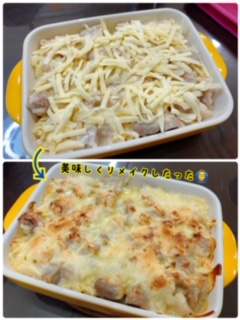 お子ちゃまには少し牛乳で薄く伸ばしたものを耐熱容器にいれてマカロニと合わせてグラタンにしました😊