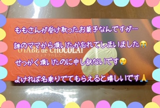 もの忘れに注意😭 2021.10.132020.01.29 せっかくママたちからいつも美味しいお菓子やパンなど頂き物をしているアップル園ですが… ショコラの入った生八つ橋を頂いたママを忘れてしまいました😭 頂いた時に少し違う話に熱中してしまったようで、その話の方が頭に残ったももさん… ボケてしまったももさんに救いの手をお願いします🙇♂️ 「私だよ〜🙋♀️」ってこっそり教えてください🙏 ももさんが責任持って紹介します!笑 1/29のごはんはカレーライス🍛でした😊
