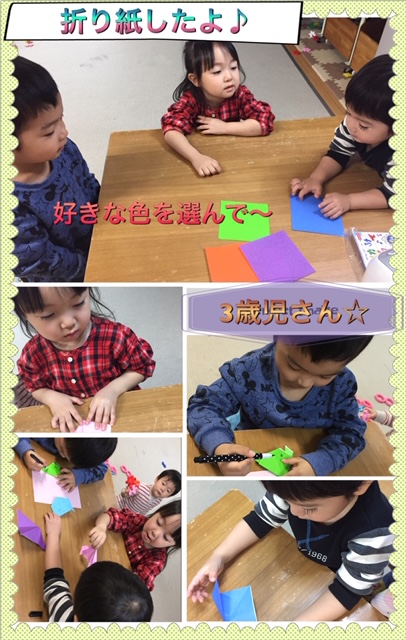 お散歩には行けないので、3歳さんはお部屋の中で折り紙をしました😉