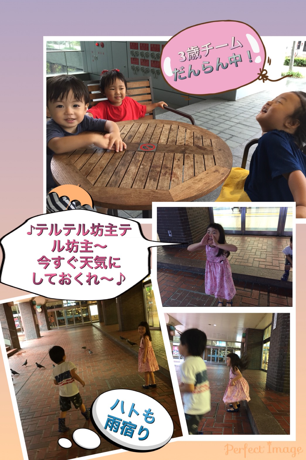 雨降るかな〜❓☔️ 2021.10.132018.09.10 今日は、なゆちゃん達を幼稚園に送りがてら朝のお散歩に出かけました🚶♂️ 幼稚園で先日の地震や台風の災害募金もしてきましたよ!💸 その後は雨が降ってきたので、歩ける子達で地下をぐるり散歩👦 今日も仲良しな3 歳児さん♪ 5歳児ペアは…「ハトも雨宿りだね」と気にしつつ… ♪テルテル坊主の替え歌熱唱中(笑) 明日は晴れるといいね〜😊
