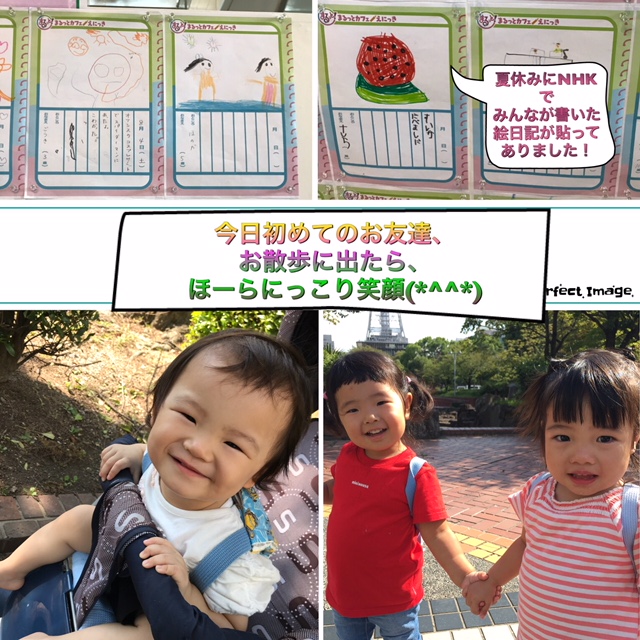 挨拶回り❓🤔 2021.10.132018.09.05 昨日の台風で、道端には葉っぱがいっぱい!! お掃除してくれているおじちゃん達に、「ありがとうございます!ご苦労様です!」って挨拶回り散歩になりました😄 少しでも晴れの日が続くといいね♡ そして午後からのお散歩でNHKに行ったら、みんなが夏休みにNHKで書いた絵日記が貼り出されていましたよ〜😊 今度はみんなで見に行こうね〜😳 9/5のごはん↓ ☆クリームコロッケ ☆厚揚げと野菜の味噌炒め ☆春雨サラダ ☆ごはん🍚 ☆オレンジ🍊