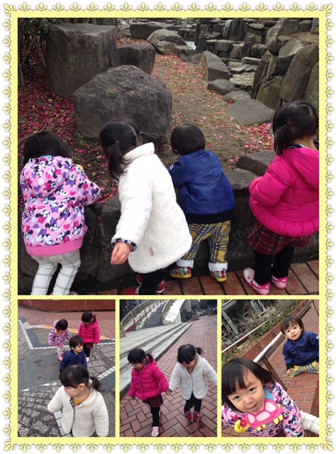 広場に着くと、ひなみちゃん、りりいちゃん、花壇の隙間に残っていた雪を発見❄️❄️