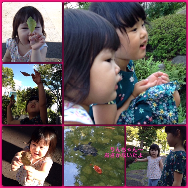 そんな中、りんちゃんとゆいちゃんは葉っぱを拾って上を見上げては…