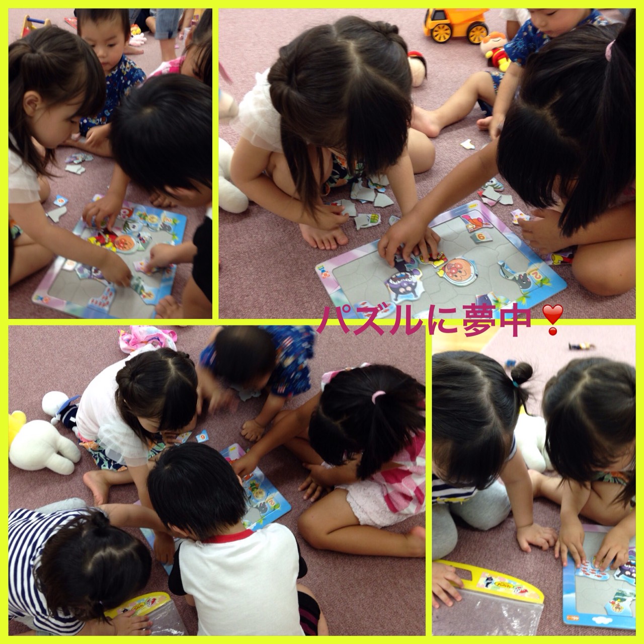 みんなで力を合わせてアンパンマンのパズルを組み立てています…