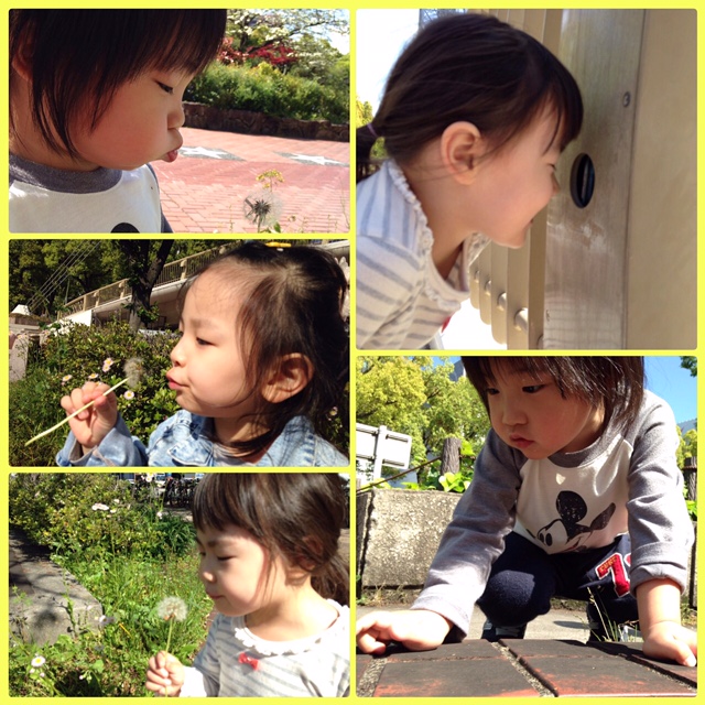 3歳チームの3人はタンポポのわたげを一生懸命吹いてます…