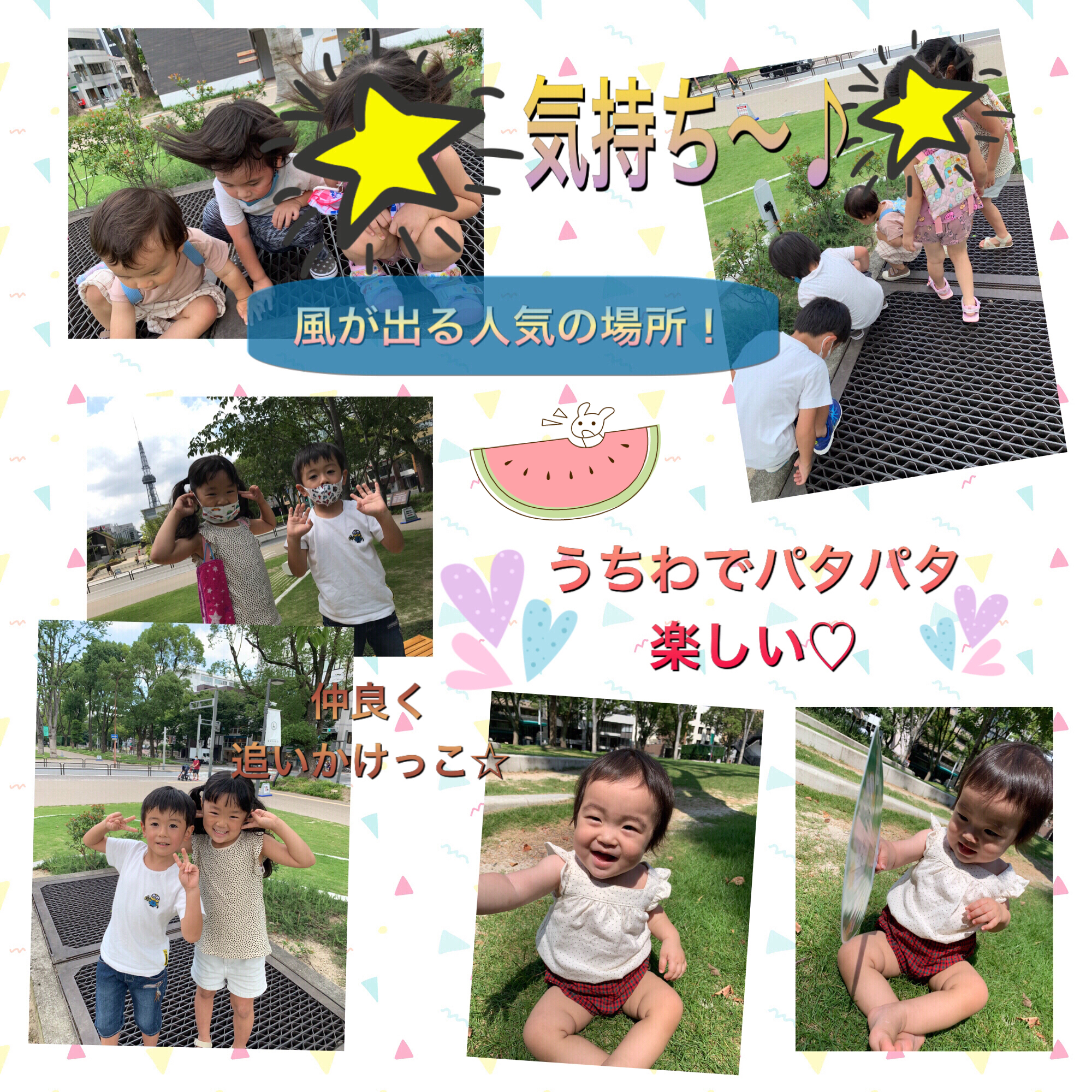 真夏の子ども達! 2021.10.132021.07.22 今日から連休がスタートしました! 初日からお天気にも恵まれて晴天☀️ ベビーちゃんも朝の涼しいうちに外に出ていい気分♪ニコニコ笑ってご機嫌さんでした❗️うちわを渡すとぎゅっと握って上手に手を動かし、パタパタして遊んでいました✨声を出して笑う姿はとても可愛らしく感じました😊 広場でおにごっこをしたり、トンボを追いかけたりして綺麗な青空の下で、元気いっぱい走り回っていました✊ 午後からもお散歩に行き、涼しい木陰を選んで遊び友達との会話を楽しんでいました😁