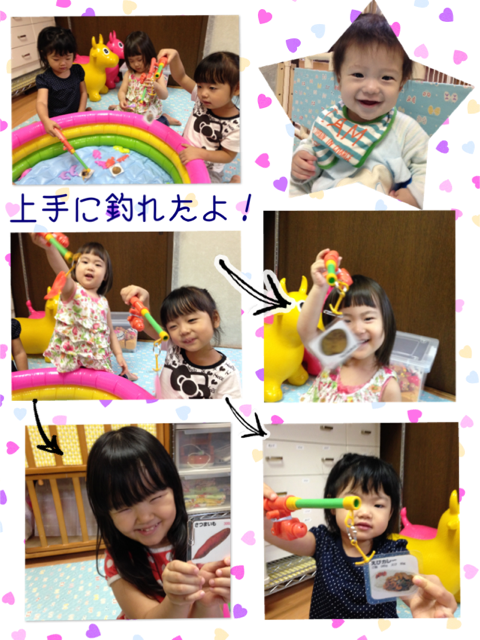 100均で買ってきたマグネットで釣る釣竿とラミネートしてあるいろんな食材やごはんを釣って遊んじゃいました(●´д`●)