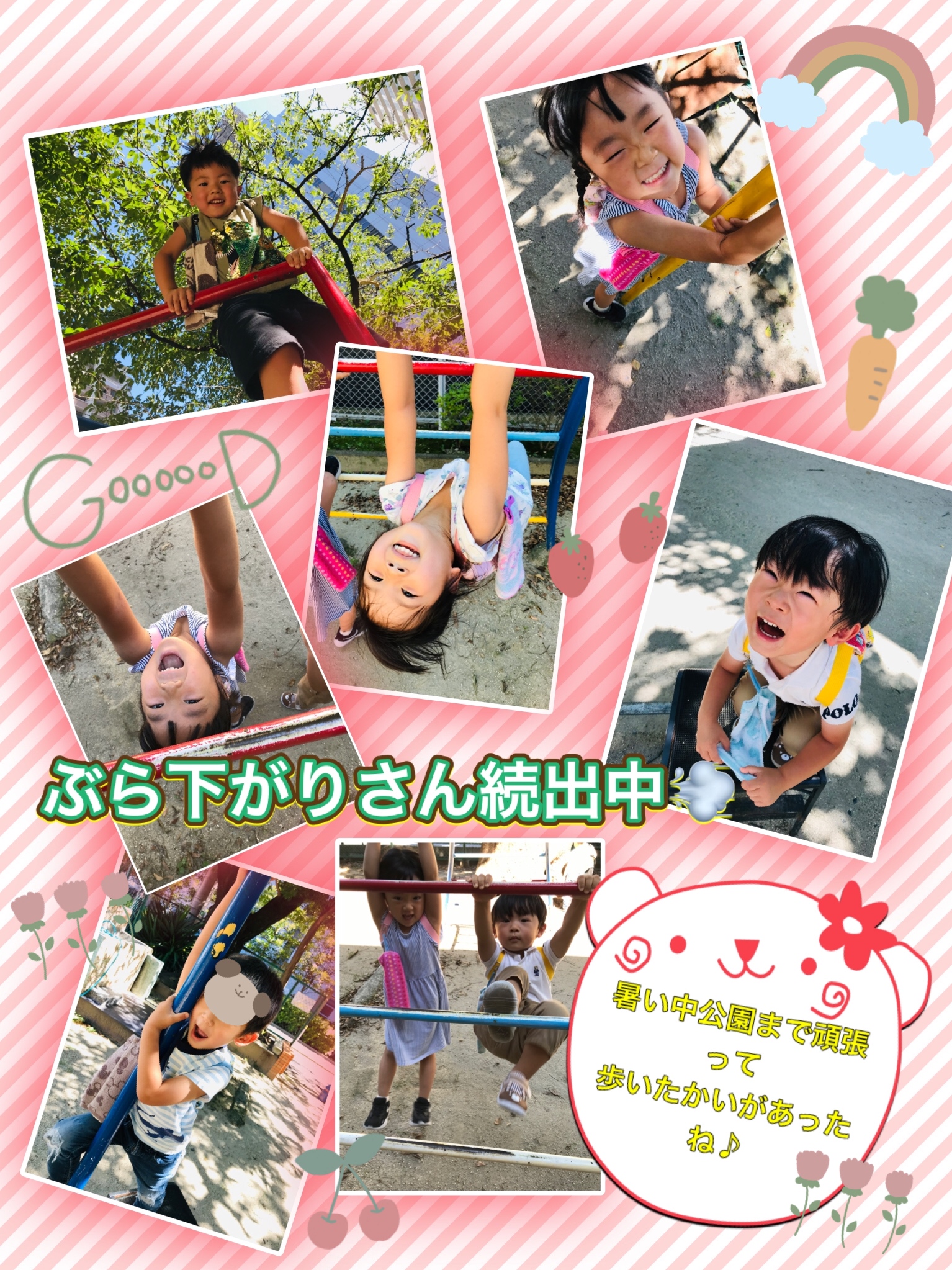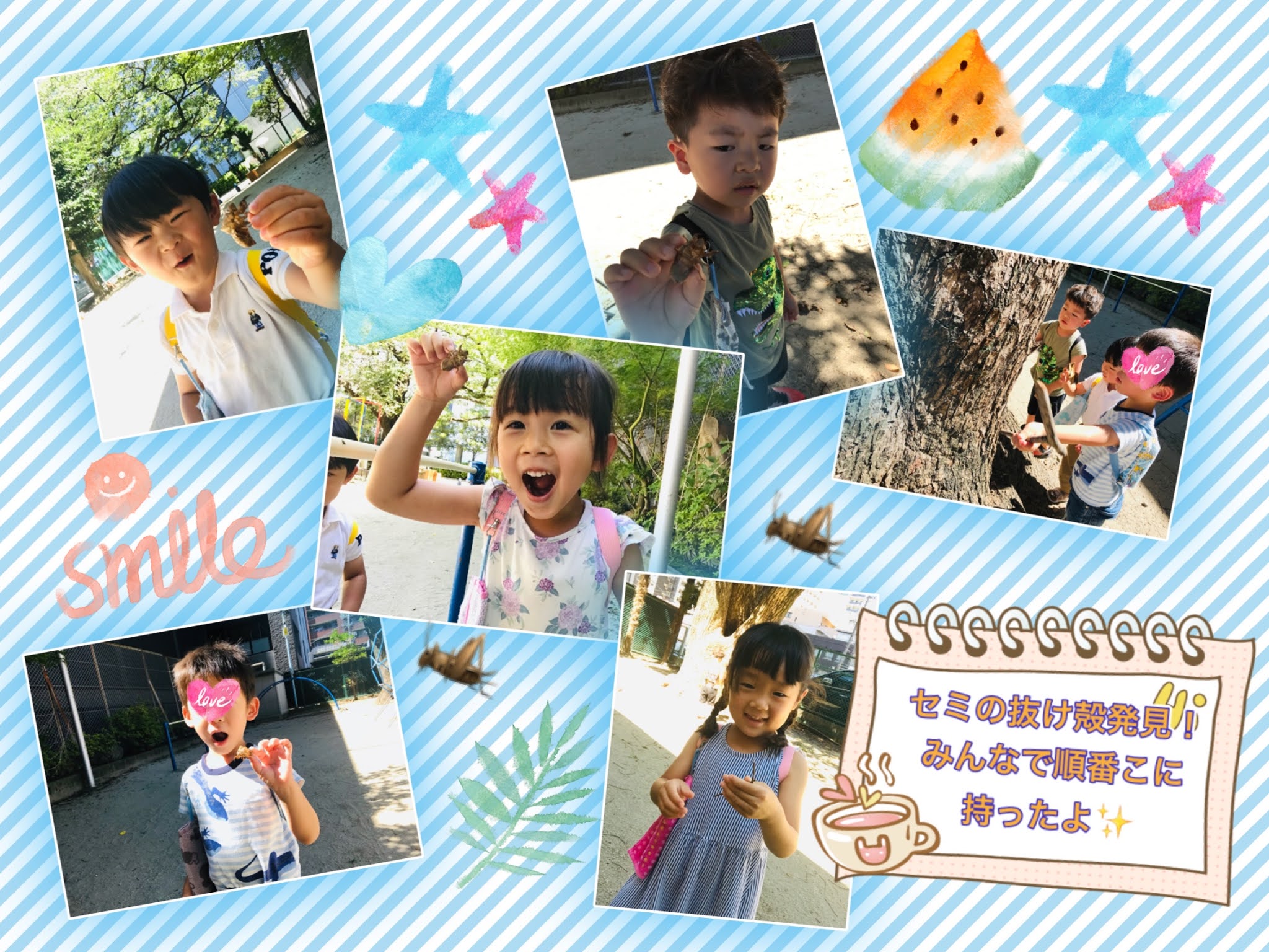 Untitled Post 2021.10.132021.07.19 日差しが強い中でしたが今日も 元気にみんなお外遊びしに行きました〜✨😊 今日はセミ探しの探検🔍というテーマが あったようで男の子が先陣をきって公園へ🍀 それならしっかりまずはみんなで 虫除けスプレータイム♪ そして宣言通り公園に着くと 木の隅っこにセミの抜け殻を発見! ちょっこ怖がりながらもみんなで 順番にセミの抜け殻を持って、、、 あれれ?1人だけ抜け殻じゃなくて 木の棒を持ってお写真を撮った子が🤣 触ってみたかったけどちょこっとだけ 怖かったんだもんね🥺
