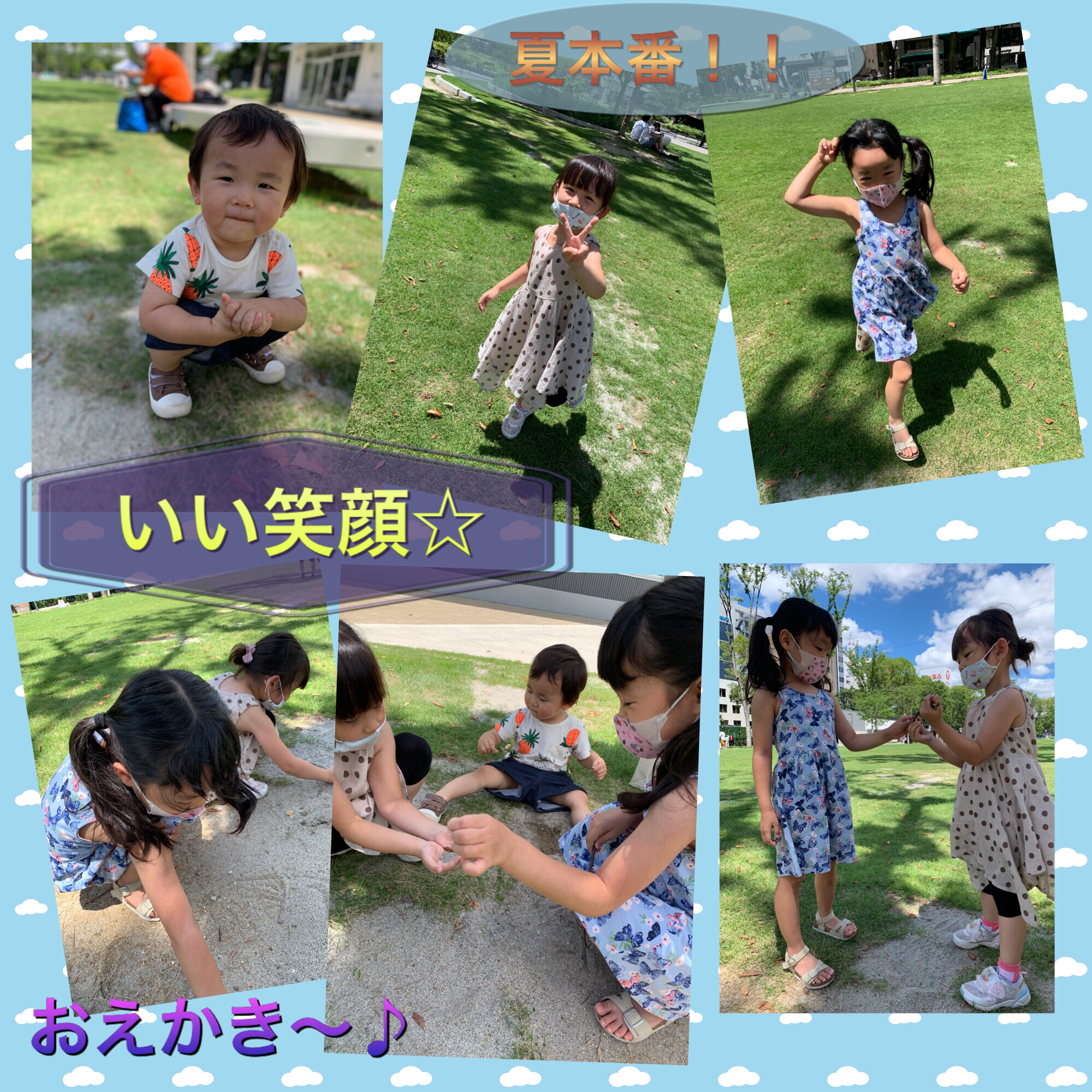 久屋大通りの広場で遊びました♪虫探しをしたり、バナナおにごっこをしたり夢中になっていました❗️先生も一緒におにごっこに参加したけど、暑さでバテバテです💦