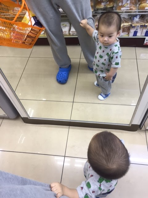 コンビニの中にある大きな鏡に映るごうちゃん…
