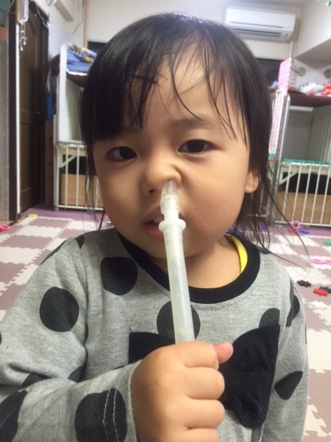 モーター音がなると上手に片方の鼻の穴めがけて管を運んでくわけですが、普段先生たちにやってもらう時は無表情で鼻水を吸われてるのに、自分でやるとなに?(゚Д゚)