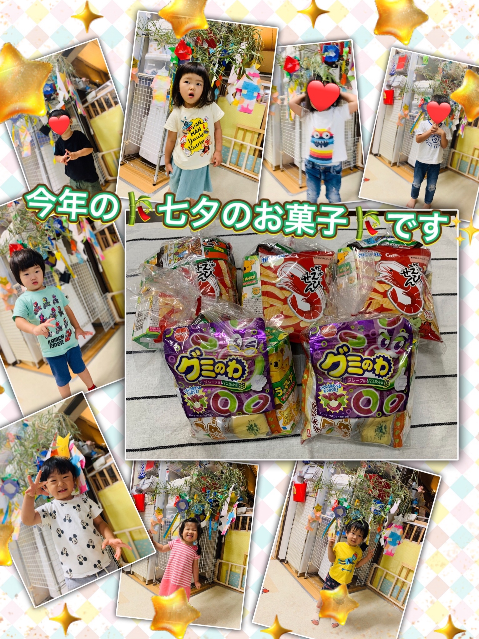 今年の🎋も雨💦… 2021.10.132021.07.07 朝から生憎の雨。 一時的に外が真っ白になるほどの豪雨もあり、 一日中お部屋遊びでした〜💦 今日は七夕🎋! 昨年に引き続き、コロナ禍の為アップル園の恒例だった大きな笹は今年も見送ることに。。。 でも七夕のお菓子は今年もありますよー❣️ みんなよかったね〜😊 もも先生、いたる先生ありがとう〜✨✨ 天の川は見られないけど、お願い事はみんなしておこうね〜😁🎋