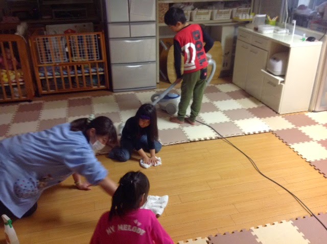 新4年生のひなたくんが掃除機、この4月からピカピカの1年生のさくらちゃんとちひろちゃんが雑巾がけをしてくれたんです!!!フロア全部ですよ!!!