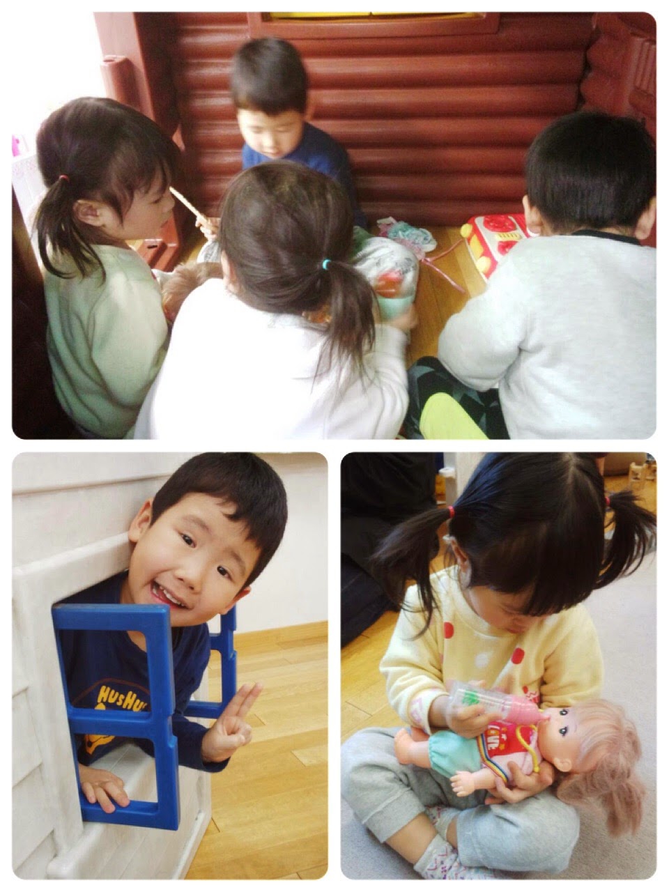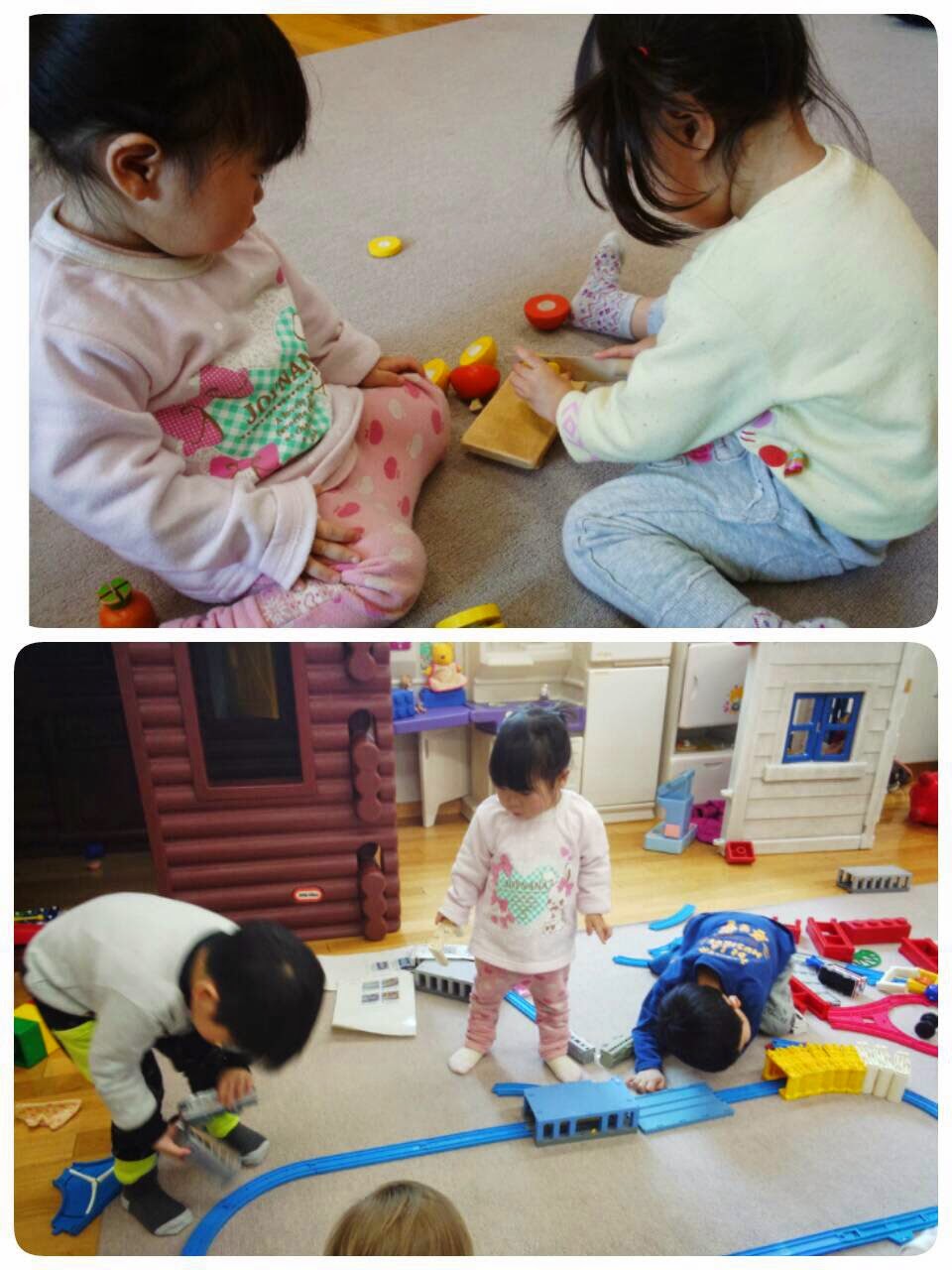 赤ちゃん人形のオムツを替えてミルクあげたり、男の子達はヒーローごっこしたり、一生懸命プラレールを組み立てて電車を走らせたりととっても楽しそうでした(^_^)v