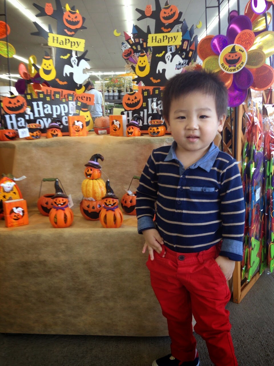 カーマの園芸店の前にいっぱいのどてかぼちゃの飾り物(失礼‼︎ハロウィン)を見つけてりゅうせい君大喜び(●⁰౪⁰●)