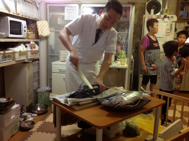 大将の計らいで急遽もみちゃんのパパ、ゆいとくんのパパも大将の指導で魚をさばくのを手伝ってもらいました(●⁰౪⁰●)