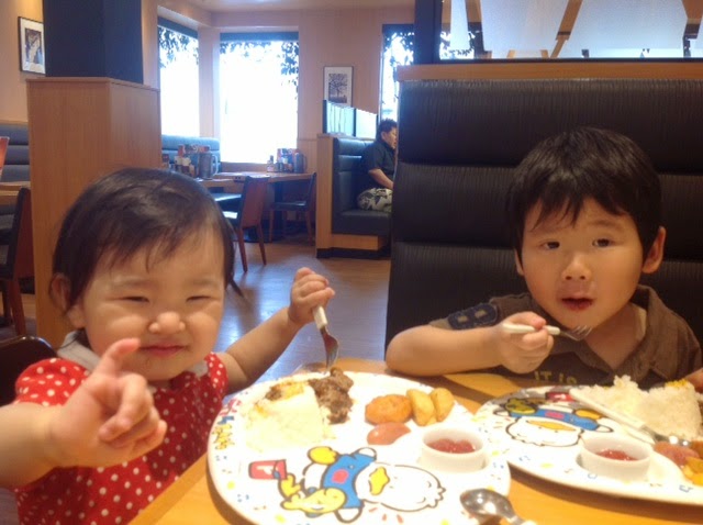 お店の名前は『宮ステーキ』稲沢店?二人共お行儀良く完食 なおかつももさんの分も頑張って食べてくれました(^_−)−☆。