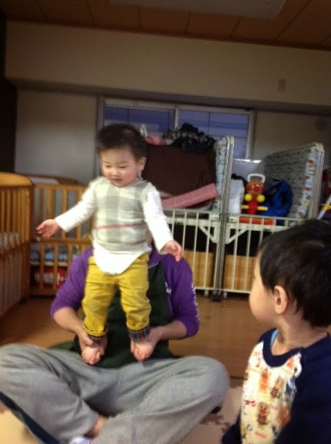 園長が1才2才の子ども達を手のひらに乗せてバランスをとって遊ぶのが、アップル園では大流行