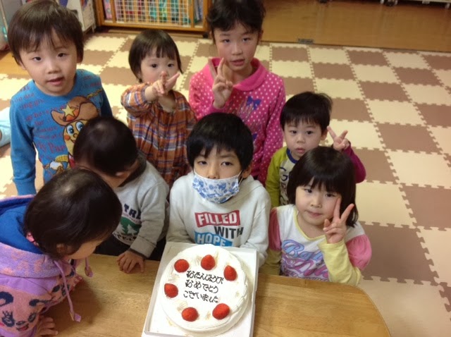 ケーキをつぶされる前に 写真を撮ってしまいましたが、たまたま早く登園してる子ども達で
